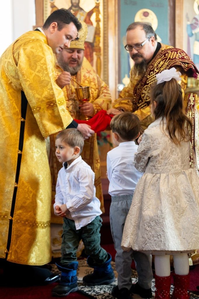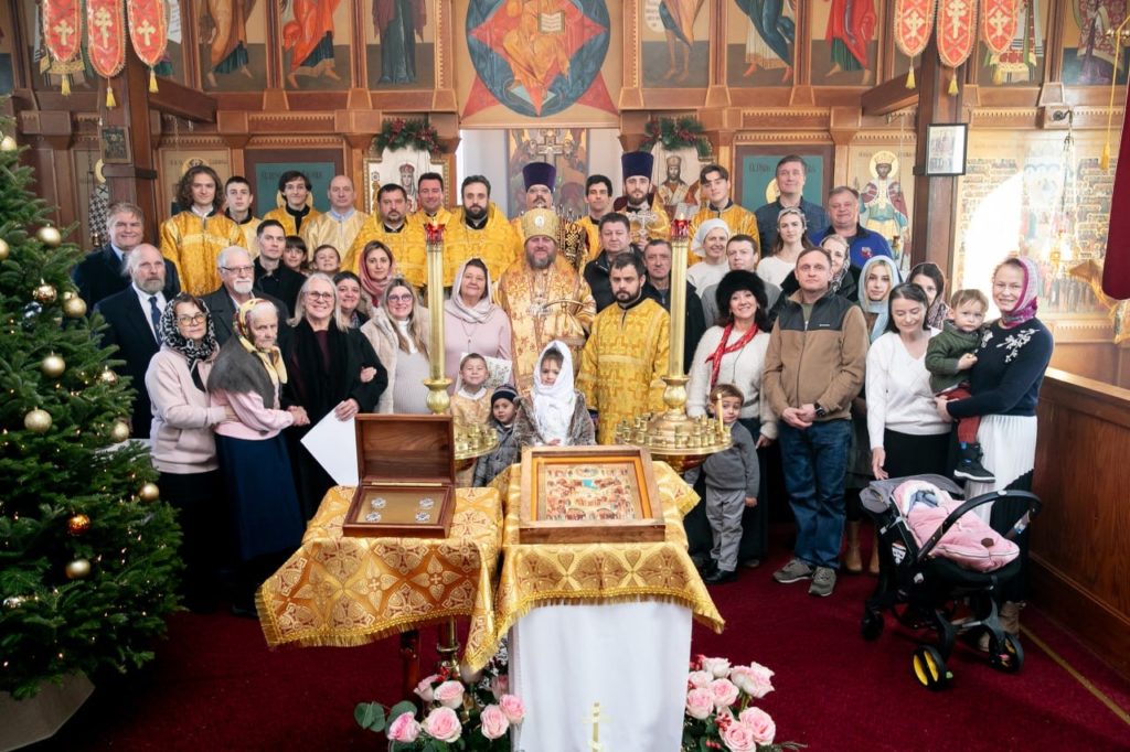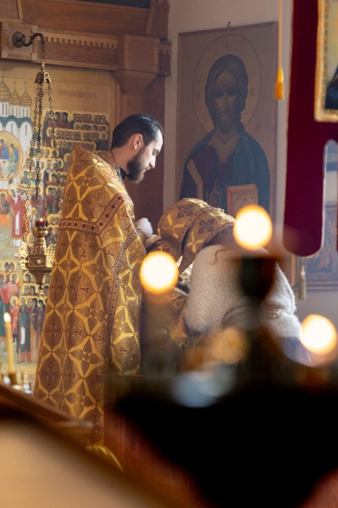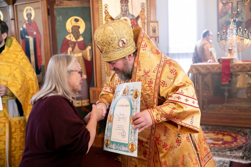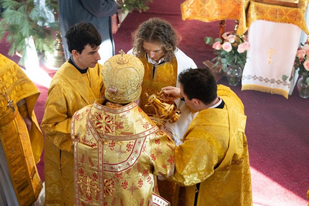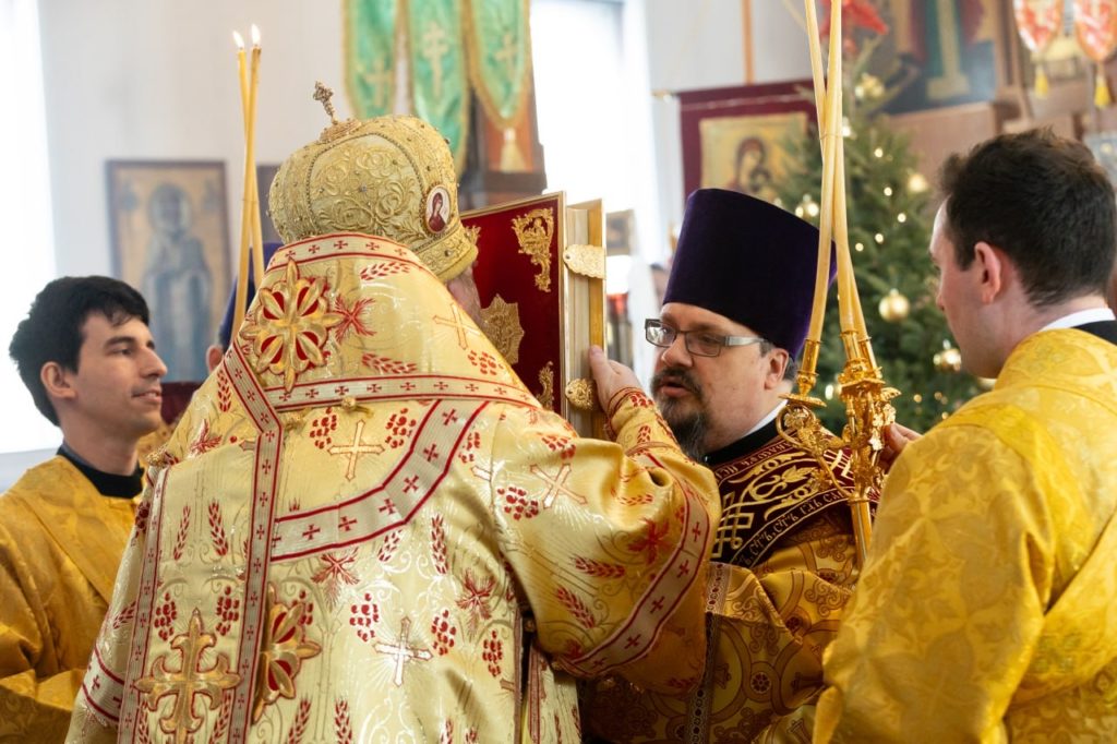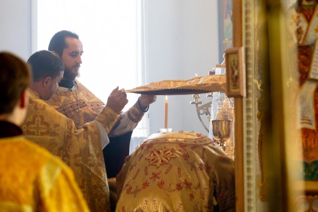 Перед входом в храм владыку хлебом-солью тепло встретили матушка Екатерина Бабийчук и матушка Ольга Куликовская и их дети. Богослужебные песнопения исполнил приходской хор под управлением Алены Бабийчук. За Литургией молились прихожане храма и гости прихода.