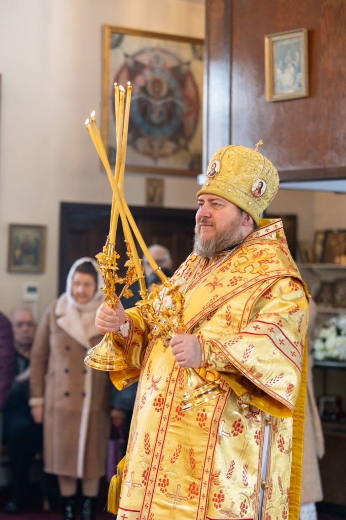 По окончании богослужения архипастыря сердечно приветствовал о. Артемий, который выразил благодарность от лица всех присутствующих за долгожданный визит и неизменное попечение о нуждах прихода во время болезни и после кончины многолетнего настоятеля храма митрофорного протоиерея Николая Бабийчука в 2022 году.