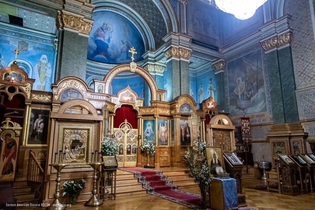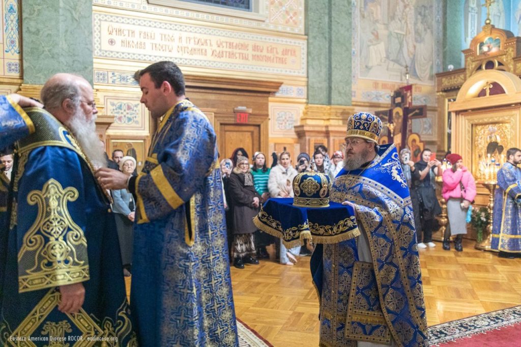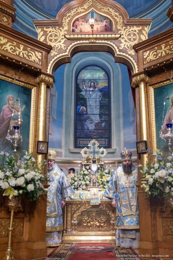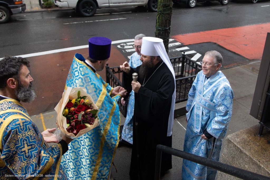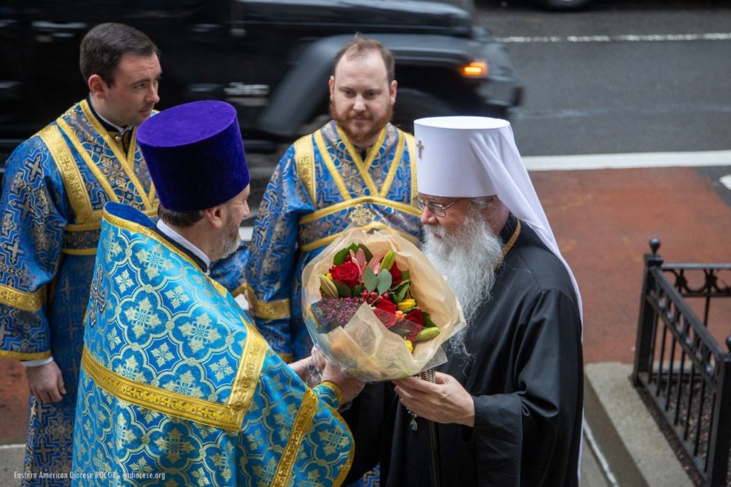 The Divine Liturgy on this festive day was celebrated by the Primate of the Orthodox Church in America, His Beatitude Archbishop of Washington, Metropolitan of All America and Canada, Tikhon. Concelebrating with His Beatitude was a gathering of hierarchs and clergy from Orthodox jurisdictions in North America: First Hierarch of the Russian Orthodox Church Outside of Russia, Metropolitan of Eastern America and New York Nicholas; Archbishop Irénée, ruling hierarch of the Archdiocese of Ottawa and Canada of the Orthodox Church in America; Bishop Irinej, head of the Eastern American Diocese of the Serbian Orthodox Church in the USA; Bishop Matthew of Sourozh, Acting Administrator of the Patriarchal Parishes in the USA and Canada; Protopriest Igor Vyzhanov, rector of St. Nicholas Cathedral in New York; Protopriest Thomas Zain, Vicar General of the Antiochian Archdiocese; Priest Alessandro Margheritino, Acting Chancellor of the Orthodox Church in America; Protopriest Seraphim Gan, chancellor of the Synod of Bishops of the Russian Church Abroad, along with clergy of the Patriarchal Parishes in the USA and the Russian Church Abroad.
