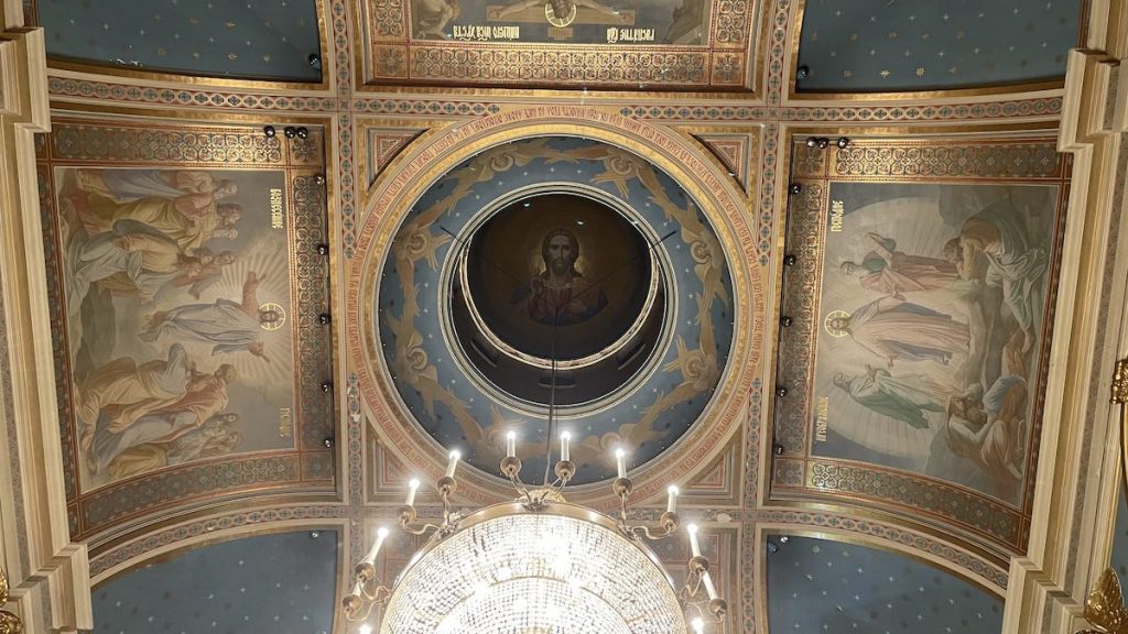 За основу композиции храма было взято Традиционное расположение сюжетов, от Господа Вседержителя в куполе, вниз — через Небесные Силы, к великим событиям Евангелия: Преображению, Распятию Господню, Вознесению и Сошествию Святого Духа на Апостолов — в верхней части храма, на вогнутых поверхностях «Неба».